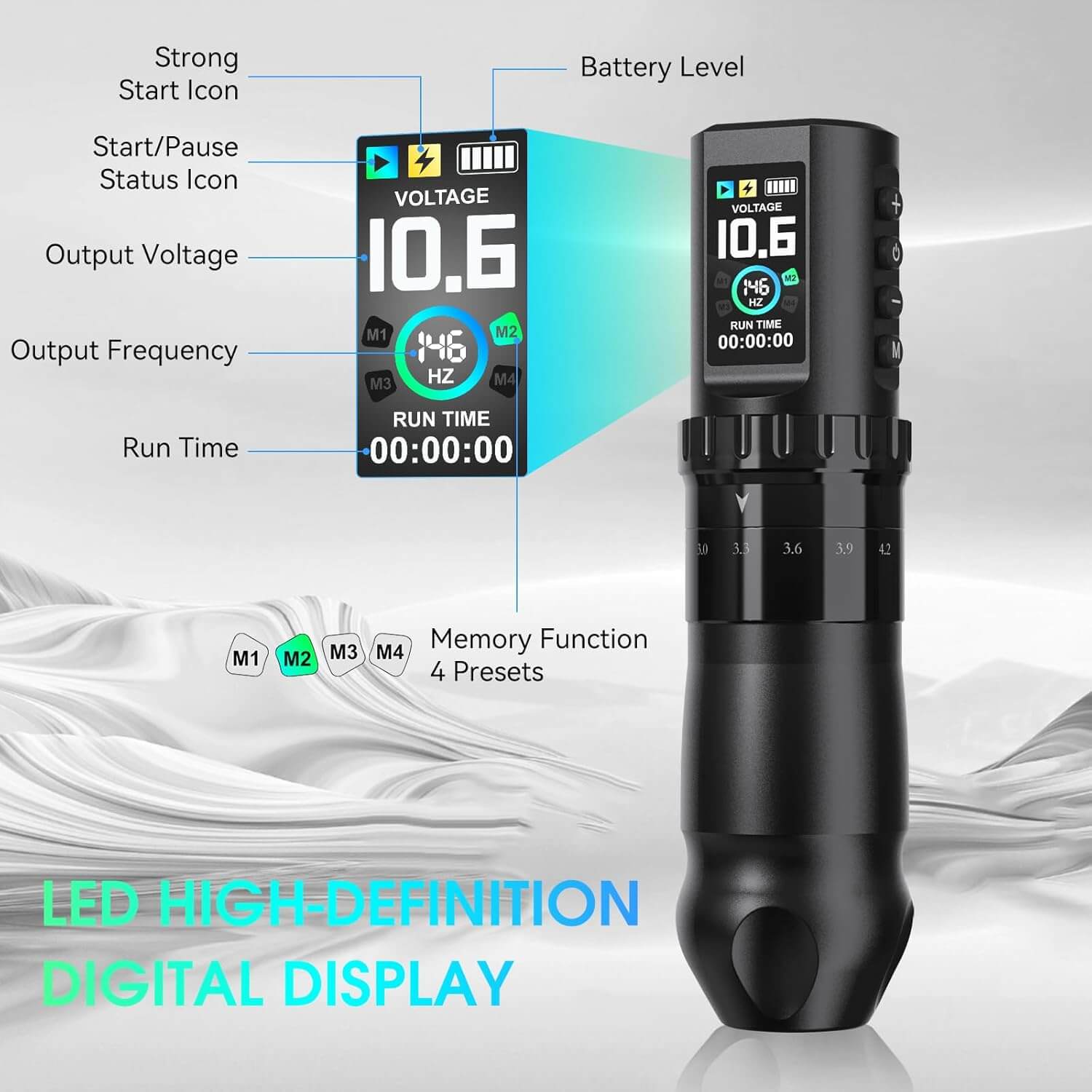 Mechanical Aesthetic Design with Intuitive Display: Featuring a rugged, mechanical-inspired body and a large, easy to read screen, this tattoo pen ensures clear visibility of settings and operation status. Built to withstand demanding environments, it combines durability with user-friendly functionality